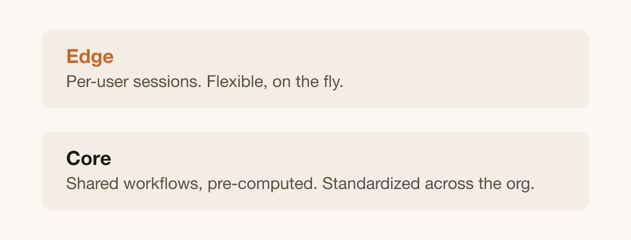 But if I were starting again, I'd be quick to standardize those workflows in parallel. One pattern explains why: agents repeat the same work across the company. Summarizing a customer's state across Salesforce, product analytics, usage data — every agent pulls together the same picture from scratch, every time. Martin Kosk, our enterprise architect, proposed a useful frame for this: core vs. edge. Edge is the end-user agent session, where everything is computed on the fly. Core is a set of recurring workflows (also agent-driven) that pre-compute and cache information for every edge session to reuse.