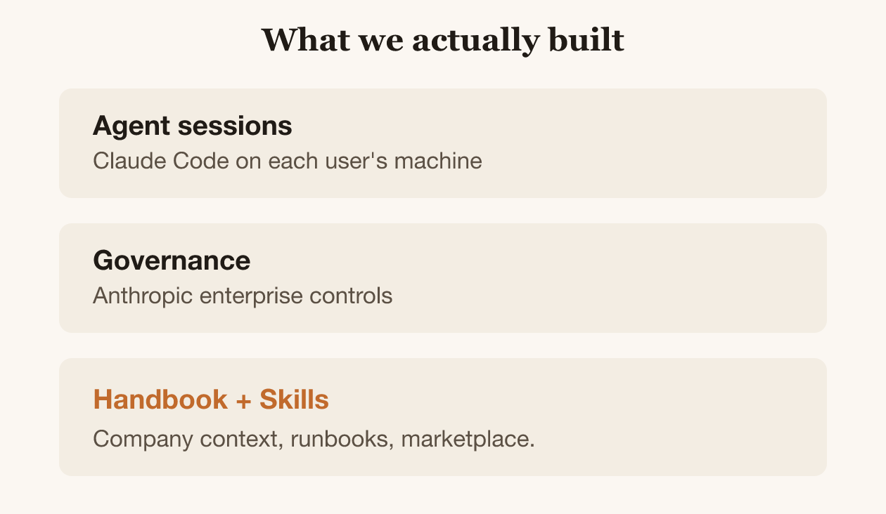 If you standardize the repeatable workflows centrally, you get cost savings, but you also get something more important: you don't need to teach everyone how to use Claude.
