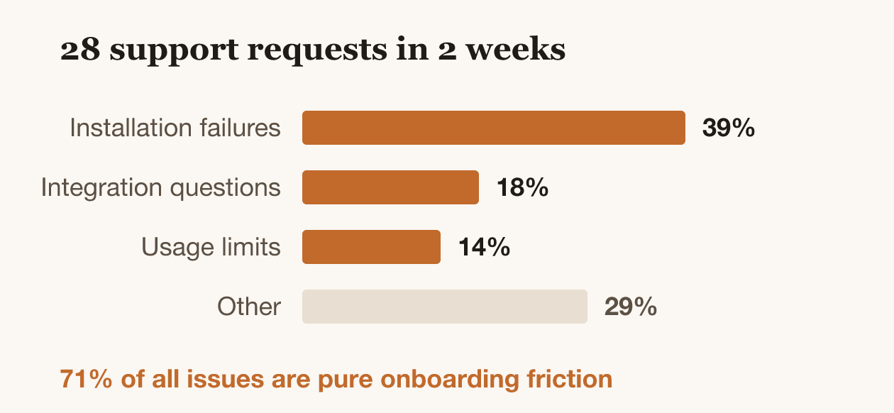 As we rolled out Claude, the #1 support issue wasn't "how do I prompt" or "what should I use AI for." It was brew conflicts on managed Macs. In 28 support requests in two weeks: 39% were installation failures, 18% were integration questions ("can Claude connect to X?"), 14% were usage limits. 71% of all issues are pure onboarding friction.